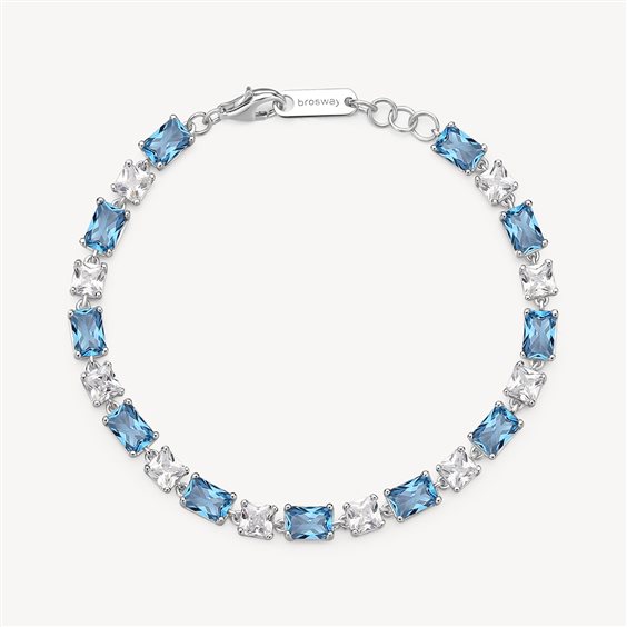 Bracciale in argento rodiato 925‰ con cushion cubic zirconia chiari e baguette cubic zirconia colore sapphire.