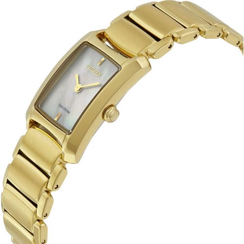 Orologio solo tempo.Cassa tonneau acciaio lucido PVD oro giallo, dimensioni 20x30mm. Movimento al quarzo ore e minuti Eco-Drive (a carica luce infinita) riserva di carica 8 mesi. Vetro zaffiro. Quadrante madreperla,lancette ed index lucidi oro .Bracciale regolabile in acciaio PVD oro giallo spazzolato centrale, fianchi lucidi,chiusura 'a scomparsa'a farfalla con pulsanti. Impermeabile 5 atm.