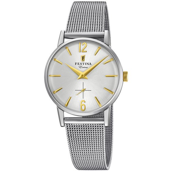 Festina attinge dalla sua collezione datata 1948, il design semplice e attuale viene riproposto e si ispira ad oggetti che sfidano il passare del tempo. riproposti in versione quarzo, due sfere e circolare dei secondi a ore sei. Lancette e indici sul quadrante laminati oro esaltano la colorazione argento del quadrante. Bracciale in maglia Milano regolabile, vetro acrilico bombato, fondello a pressione.