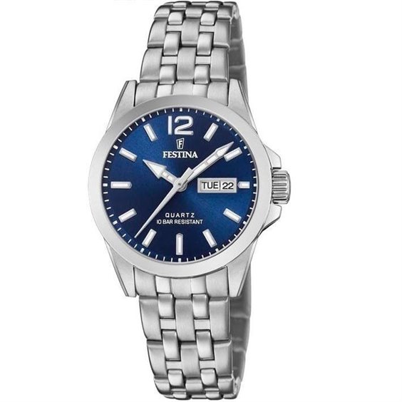 Orologio solo tempo, SUB 100metri donna 30mm diametro cassa di festina con cassa in acciaio di forma rotonda, protezione della corona, quadrante blu, datario doppio giorno-data , indici e lancette luminose al buio.Fondello avvitato, bracciale in acciaio, chiusura tradizionale regolabile.