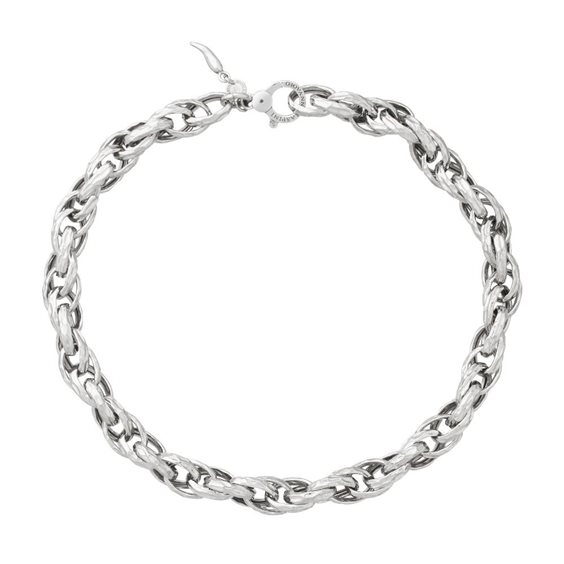 Giovanni Raspini sceglie una catena in argento martellato ad intreccio torchon, e la trasforma in una collana raffinata e di grande impatto. L'effetto martellato amplifica la rifrazione della luce, valorizzando l'elegante texture realizzata a mano in azienda. Argento 925 Lunghezza 48 cm Chiusura con moschettone Fatto a mano in Itali