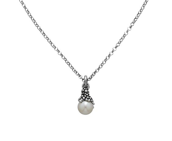 Pendente Mini Drops. Una delicata perla d'acqua dolce, incastonata da luminose sferette in argento brunito, è la protagonista di questo elegante pendente. È abbinato ad una catena corta, sempre in argento. Fatto a mano in azienda.