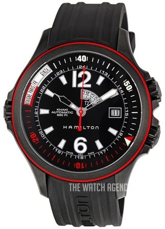 Orologio Hamilton Cassa in acciaio inossidabile PVD nero ,Cinturino in caucciù, Movimento automatico Calibro: 2893-Cristallo di zaffiro Quadrante nero GMT Mani e indicatore luminosi Data di visualizzazione Corona a vite Vedi Attraverso il caso Fermaglio fibbia Resistenza all'acqua 200M Diametro cassa approssimativo: 42 m Spessore case approssimativo: 14 mm