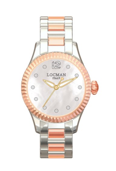 Orologio Locman Isola d'Elba lady solo tempo con movimento al quarzo; cassa do 30 mm, in acciaio color acciaio con trattamento PVD colore oro rosa sulla ghiera zigrinata, fondello in titanio; cinturino ansa 14mm in acciaio e PVD, bicolore acciaio oro rosa; impermeabilità 5 atmosfere; quadrante bianco madreperlato con indici applicati in nickel. Con scatola e garanzia originali Locman.