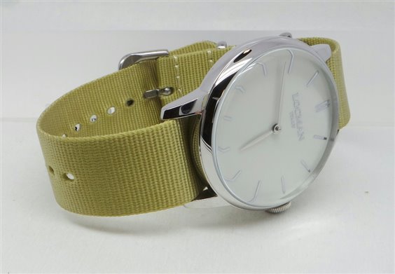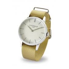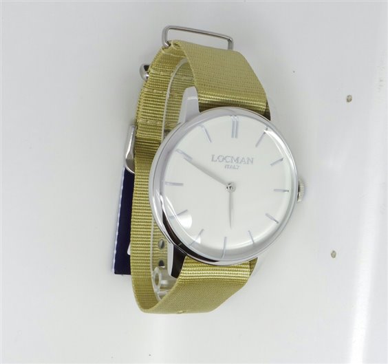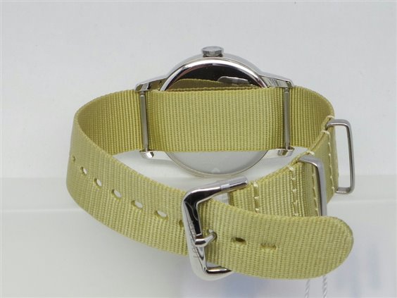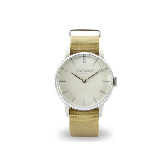 Orologio solo tempo al quarzo, water resistant 5 atm, design esclusivo italiano, cassa in acciaio 316L,fondello in acciaio, quadrante bianco,cinturino in tessuto color beige.
