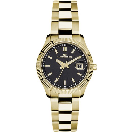 Orologio al quarzo donna con quadrante nero indici e lancette oro, fluorescenti datario ore 3.cinturino in acciaio dorato con fondello serrato a vite in acciaio