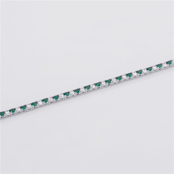 Bracciale tennis in argento 925 rodiato, smeraldi sintetici e zirconi bianchi alternati. Chiusura pinza a molla. Misura cm 16.