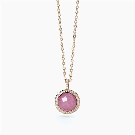 Collana donna , argento 925 placcato oro rosa 18K , lunghezza cm 43 regolabile a cm 39 , pietra doublet rodocrosite e cristallo di rocca , zirconibianchi.