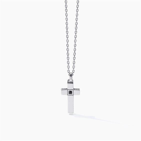 Collana girocollo della collezione Mabina Uomo Gioielli Mystical da uomo. Colore: argento e nero. Il gioiello è in argento 925 rodiato, caratterizzato da una catena forzatina e da un ciondolo a forma di croce con zircone nero e decori laterali. Dimensioni della croce: 12,30 mm x 20,40 mm. Lunghezza 50 cm, con chiusura a moschettone.