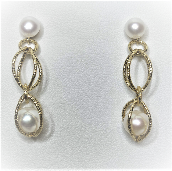 Orecchini pendenti Miluna realizzati in argento 925 color oro. Presenti 2 perle FW bottone col. bianco 5,5-6 e 2 perle FW terminali col. bianco 7-7,5. Lunghezza pendente 3,5 cm.