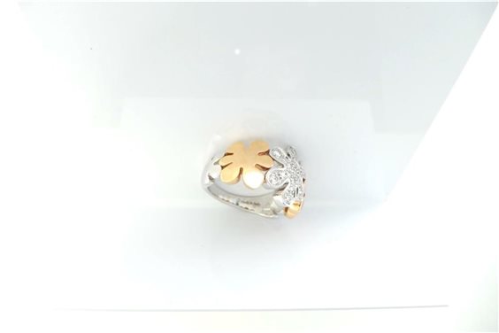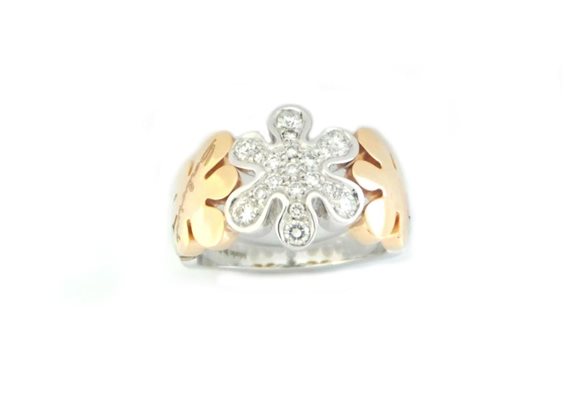 Anello in oro bianco e rosè 18 Kt, con diamanti Kt. 0,31, taglio brillante, colore H. Larghezza massima del fiore centrale cm 1,4. Peso Gr.9,50.