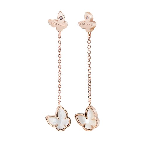 orecchini in oro rosa a forma di farfalla con piccolo diamante. pendente a forma di farfalla con madreperla