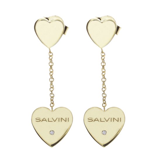 Orecchini pendenti con cuori della collezione I segni in oro giallo 9kt con diamante a taglio rotondo di caratura 0,02 di colore GH.