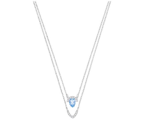 L’irrinunciabile collana interpreta la tendenza del momento grazie al suo profilo stratificato, impreziosito da cristalli pear-shaped azzurri, che conferiscono al gioiello una suggestiva nota cromatica. La collana sfoggia anche elaborati spunti in pavé di cristallo e metallo rodiato. Ideale da abbinare ad altre creazioni Swarovski,