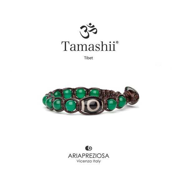 Tamashii Shonu PROTEZIONE con 11 pietre di agata verde, la nuova collezione dedicata alle nuove generazioni. La caratteristica predominante è la pietra GZI in onice con raffigurati disegni e figure simboliche. Ogni simbolo corrisponde ad una forza di supporto ai Tantra classici per rafforzare e perseguire i principi della filosofia Buddhista. I bracciali sono composti da pietre di 6 mm e la lunghezza minima è di cm. 14, ma si può adattare a qualsiasi polso grazie alle asole presenti nel cordoncino.