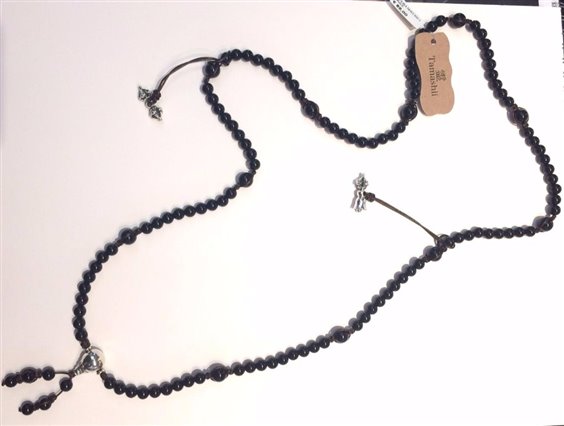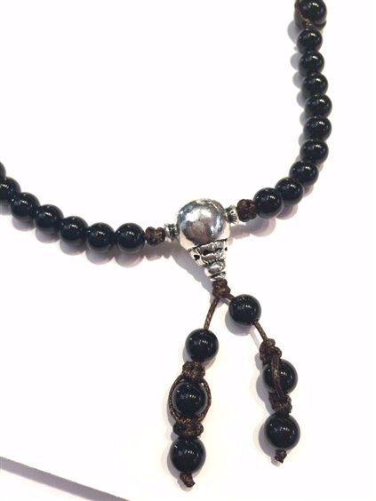 Collezione MUDRA, collana formata da piccole pietre rotonde da 0,5 mm alternate con alcune da 1 cm. Le mudra sono utilizzate nella pratica yoga come completamento di alcuni asana (posizioni) durante le fasi meditative. Le mudrā vengono usate molto nel buddhismo tibetano, anche sotto forma di movimenti, gesti, danze che vanno a completare tecniche, pratiche e meditazioni atte al raggiungimento dell'illuminazione. Vi sono appesi due ciondoli che rappresentano le campane tibetane, possono essere staccate e portate dove si vuole. Le pietre usate sono ONICE NERO.
