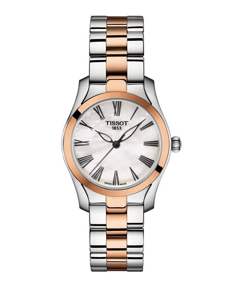 Questo orologio Tissot ha una cassa in acciaio inox con trattamento PVD oro rosa con con un diametro di 30 mm ed è dotato di un bracciale in Acciaio inox con trattamento PVD oro rosa con chiusura a farfalla con pulsanti. Le curve morbide del nastro che decora il quadrante, la preziosità della madreperla, rendono questo orologio un vero gioiello al polso delle donne. All'interno ha un movimento al quarzo è finito con un vetro zaffiro antigraffio. L'orologio è impermeabile a 3ATM. Questo significa che l'orologio resiste a piccole quantità di acqua, come lavarsi le mani. L'orologio è fornito con 2 anni di garanzia in tutto il mondo.