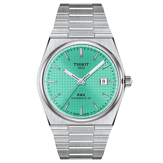 Orologio tissot PRX automatico.Diametro:40 mm Cinturino intercambiabile a sgancio rapido Fino a 80 ore di riserva di carica Cassa in acciaio inossidabile 316L Fondello trasparente Movimento automatico svizzero Vetro zaffiro antigraffio con rivestimento antiriflesso Colore verde chiaro