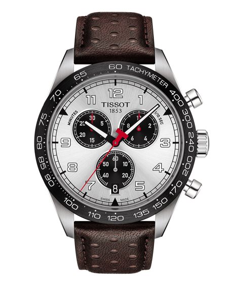 Orologio Tissot PRS 516 da uomo cronografo al quarzo Swiss Made. Cassa in acciaio con anello rosso tra cassa e lunetta in PVD nero con scala tachimetrica, impermeabile fino a 10atm. Vetro zaffiro antigraffio. Quadrante panda, argento con contatori neri, datario a ore 6. Cinturino in pelle marrone con chiusura deployante a farfalla con pulsanti.