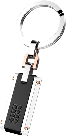 Portachiavi in acciaio 316L bicolore silver e nero con particolari in pvd oro rosa e 8 spinelli incastonati sulla targa.